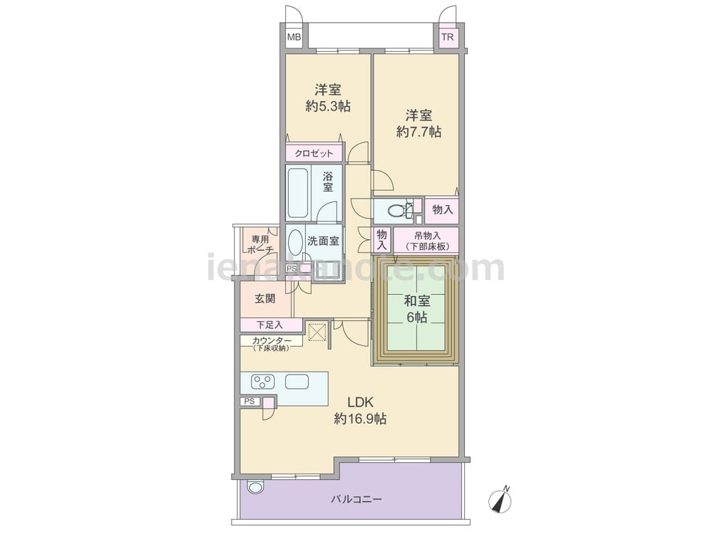 専有面積81.3平米の3LDK。玄関前に専用ポーチがあり、玄関先から室内が見通せない、プライバシーを保ちやすいプラン。LDK約16.9帖に隣接する和室6帖は玄関ホールからも出入りできます。開放的な対面キッチンは背面に便利なカウンター付き。収納が豊富にあり、トランクルームはスポーツ用品や工具、園芸用品など外で使う物を保管するのに便利です。バルコニー約12.5平米にはスロップシンクが付いています。