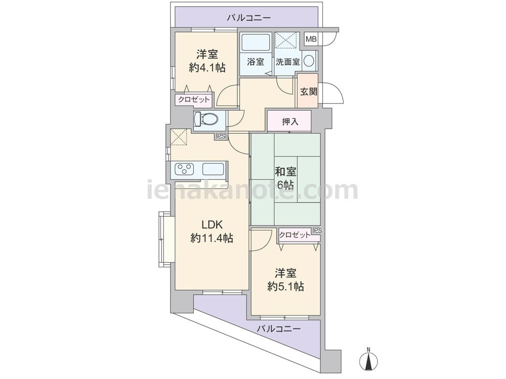 専有面積60.01平米の3LDK。南北両面にバルコニーがあるセンターインのプラン。LDKは約11.4帖、キッチンはリビング全体を見渡せる対面カウンタータイプの仕様。隣接する和室の引き戸を開放すれば、LDKをより広々と使う事が出来ます。洋室約5.1帖はLDKを通って行き来する造り。各居室に収納が設けられています。