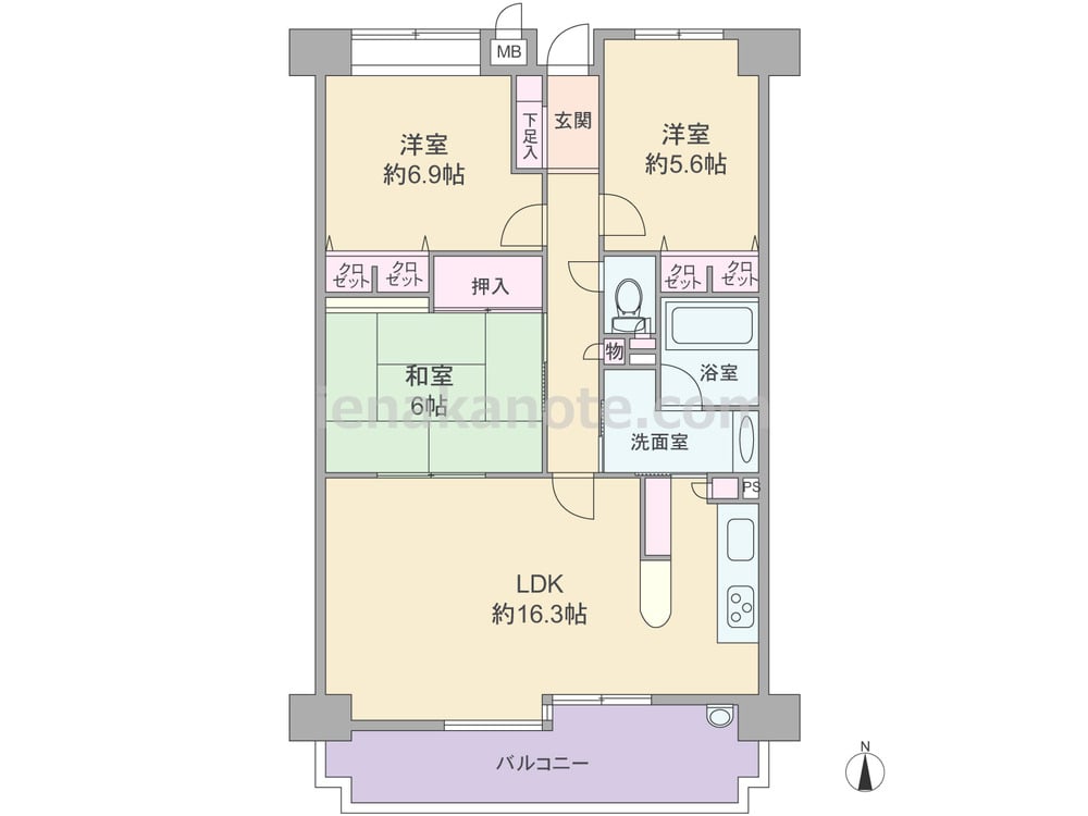専有面積76.39平米の3LDK。横長リビングのプラン。LDKは約16.3帖、隣接する和室6帖は室内廊下からも出入りが可能。ウォールタイプのキッチンは背面にカウンターがあり、洗面室へアクセス可能な家事動線のよい造りです。収納が各所にあるのもポイント。バルコニー約11.79平米にはスロップシンクが付いており、洗い物やガーデニングでの利用に便利です。