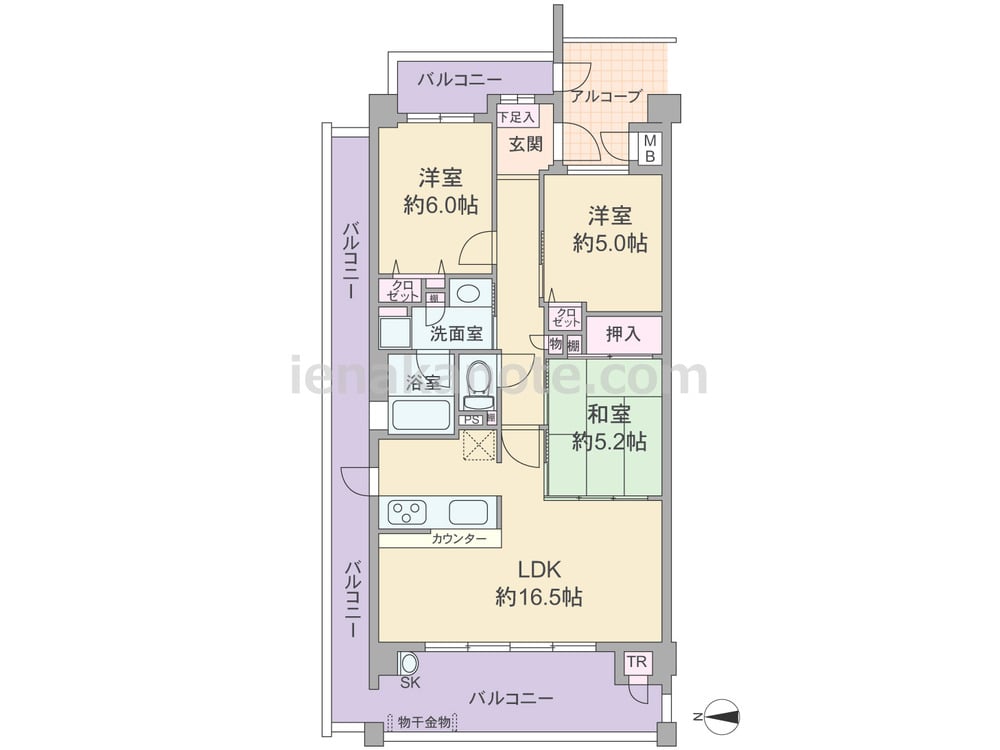 専有面積74.01平米の3LDK。玄関前にアルコーブがあり、玄関先から室内を直接見通せない、プライバシーに配慮されたプラン。LDK約16.5帖には和室5.2帖が隣接し、引き戸を開放すれば約21.7帖大の空間にする事が出来ます。和室は室内廊下からも出入りが可能。カウンターキッチンは横にバルコニーへの勝手口があります。浴室の窓は湿気がこもりにくく快適。バルコニー約29.47平米にはスロップシンクとトランクルームが付いています。