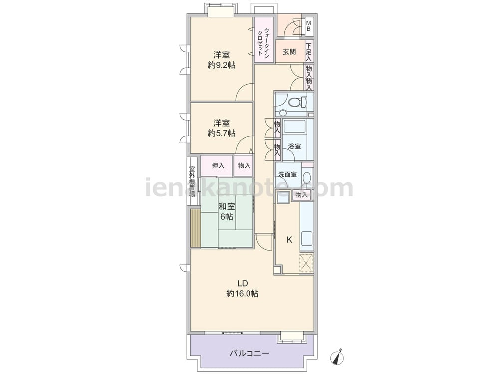 専有面積104.94平米の3LDK。居室の窓が共用廊下に面しておらず、玄関先から室内を見通せない、プライバシーを保ちやすいプラン。生活感の出やすいキッチンはリビング・ダイニングから独立しており、キッチン横に洗濯機置場があります。和室6帖はLDKと室内廊下の2カ所から出入りが可能。個室や客間など色々な使い方が出来ます。収納が豊富にあるのもポイント。バルコニーは約11.38平米あります。