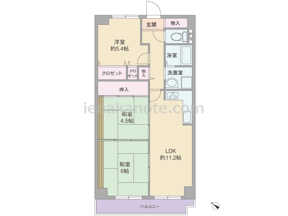 専有面積66平米の3LDK。LDK約11.2帖と和室二部屋が続き間になっており、それぞれ個室にしたり、引き戸を開放して空間を広々と使うなど、生活シーンに合わせてフレキシブルに使用出来ます。キッチンはL字型の壁付け・オープンタイプ。和室の板間は家具を置くのに便利。和室6帖には押入がありませんが、その他の居室と室内廊下、玄関横に収納が確保されています。