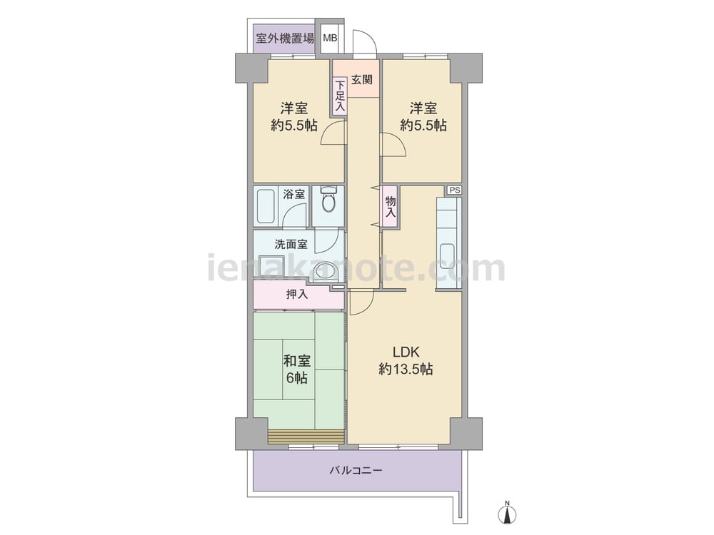 専有面積74.02平米の3LDK。LDKは約13.5帖、生活感の出やすいキッチンは奥まって配置されており、リビング・ダイニングはくつろぎの空間を演出できます。隣接する和室の引き戸を開放すれば、リビング・ダイニングをより広々と使う事が可能。洋室約5.5帖には収納が無いため、家具を置くなど工夫が必要かもしれません。
