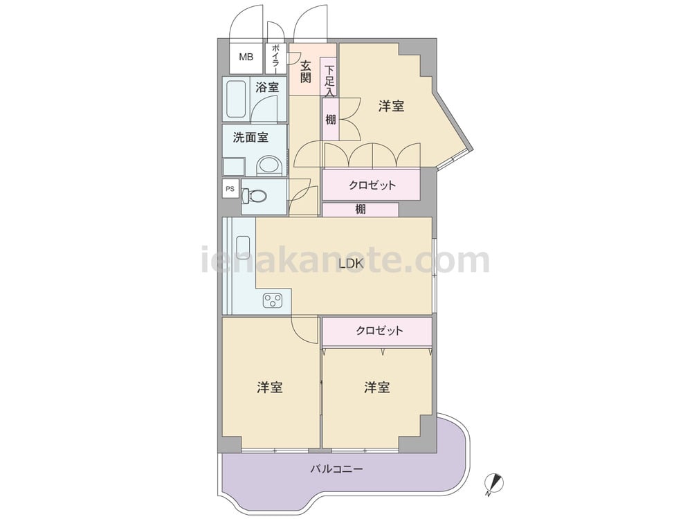専有面積64.12平米の3LDK。センターリビングのプラン。キッチンはL字型の壁付け・オープンタイプです。バルコニーに面する洋室二部屋は続き間になっており、引き戸を開放すれば空間を広々と使う事が可能。LDKと北側洋室は棚が付いています。