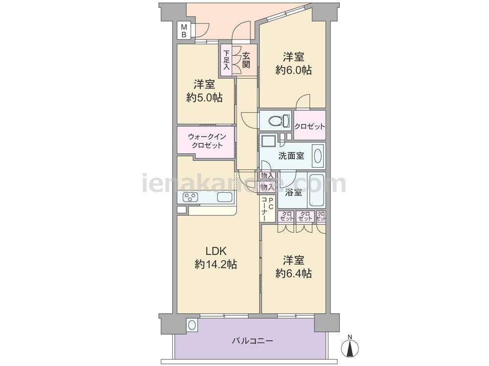 専有面積73.48平米の3LDK。LDKは約14.2帖、キッチンは対面カウンタータイプの仕様で、キッチン横には物入とPCコーナーが設けられています。収納が各所にあり、洋室約5.0帖のウォークインクロゼットは室内廊下からも出し入れ可能。バルコニーには洗い物やガーデニングでの利用に便利なスロップシンクが付いています。