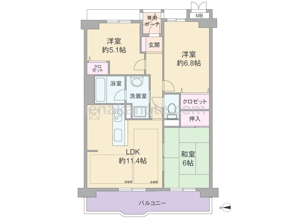 専有面積65.19平米の3LDK。玄関前にはプライバシーに配慮された専用ポーチがあります。LDKは約11.4帖、キッチンは対面カウンタータイプの仕様。和室6帖は個室やくつろぎのリビングスペースなど色々な使い方が出来ます。各居室に収納スペース付き。バルコニーは約12.21平米あります。