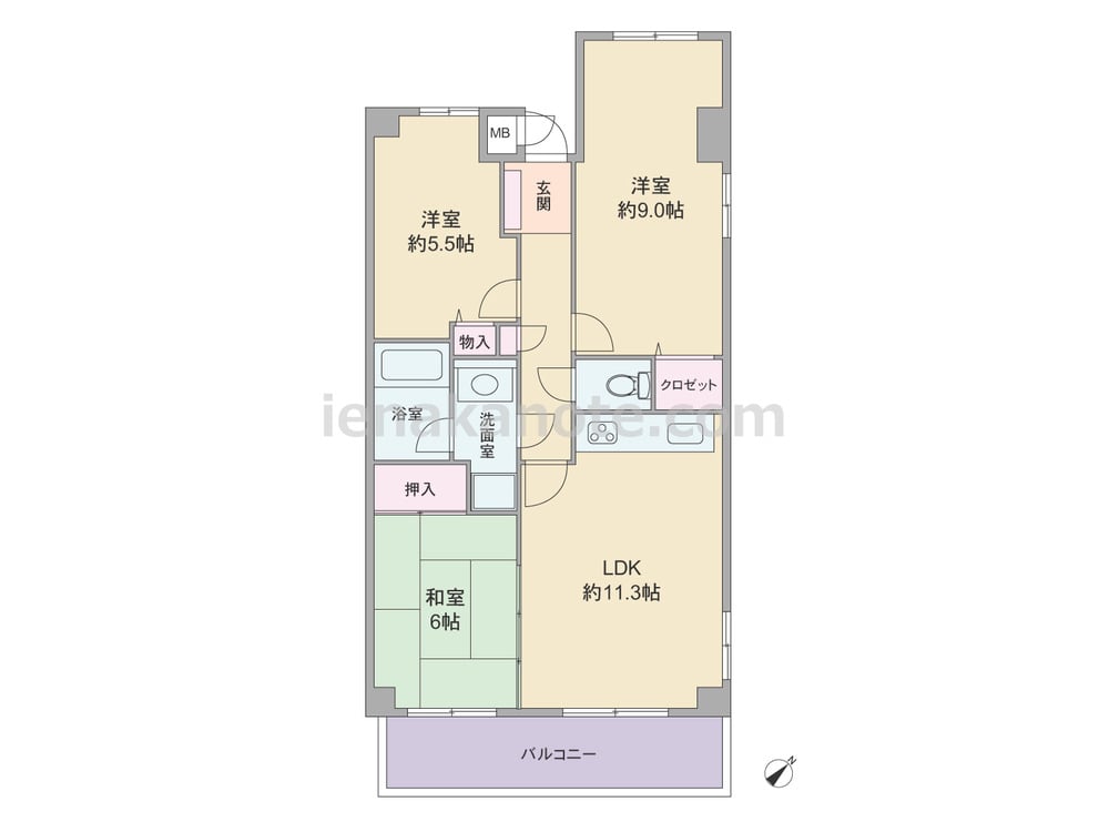 専有面積60.39平米の3LDK。全部屋に窓がある風通しの良いプラン。LDKは約11.3帖、キッチンは開放的なI型・ウォールタイプ。和室は個室にしたり、くつろぎのリビングスペースにするなど多目的に使える一室。主寝室は約9.0帖あり、各居室に収納が確保されています。
