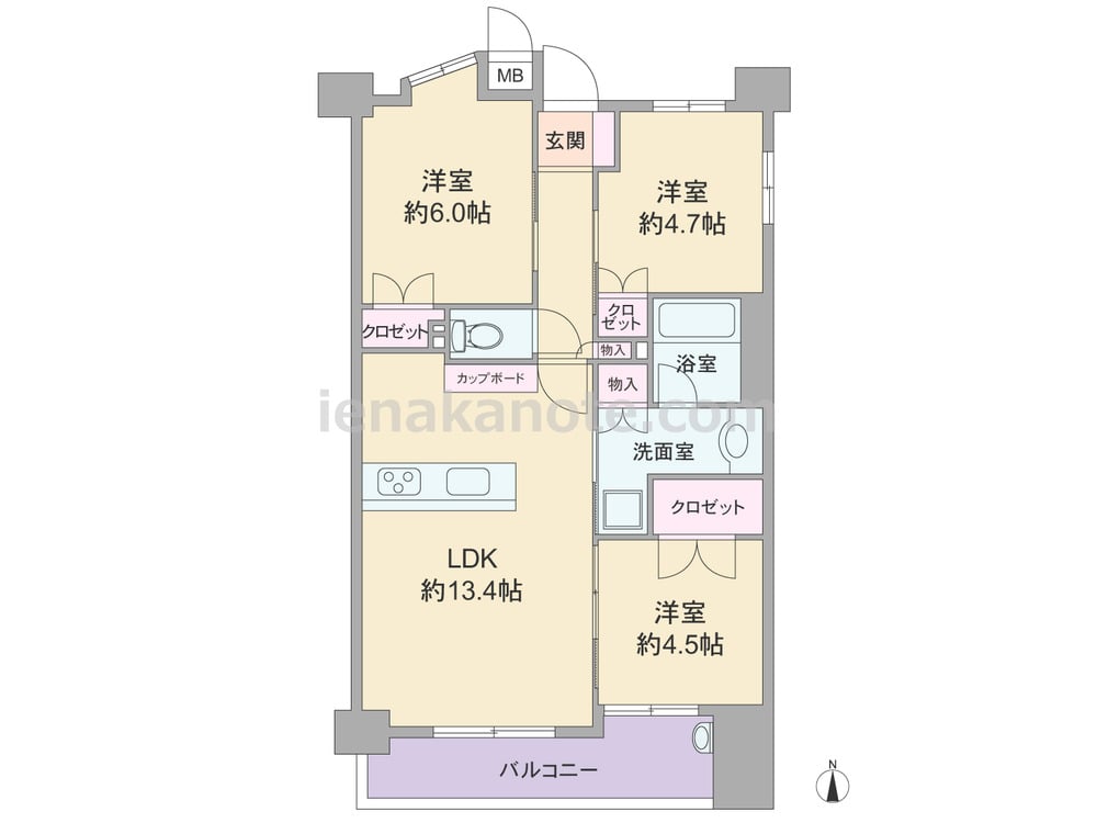 専有面積62.86平米の3LDK。対面キッチンは料理をしながら家族とコミュニケーションがとりやすく、キッチン背面にはカップボードが付いています。キッチン横に洗面室があり、家事動線のよい造りです。LDK約13.4帖に隣接する洋室約4.5帖の引き戸を開放すれば、約17.9帖大の空間に。収納が各所に設けられているのもポイントです。