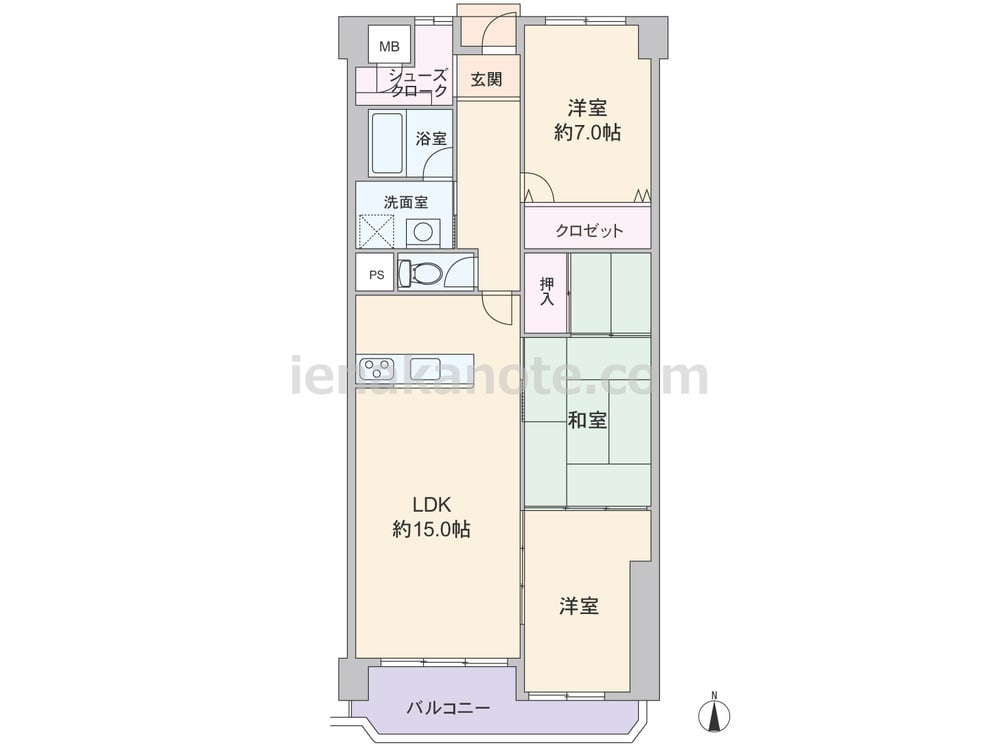 専有面積93.87平米の3LDK。玄関横にシューズクローク付き。キッチンは家事中も家族と会話を楽しめる対面式です。LDK約15.0帖と洋室・和室が続き間になっており、洋室にはクロゼットがありませんが、引き戸を開放すればLDKを広々と使う事が出来ます。