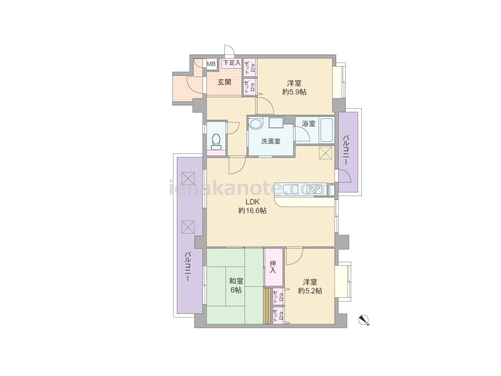 専有面積76.80平米の3LDK。住居の窓が共用廊下に面しておらず、玄関先から室内を見通せない、プライバシー性の高いプラン。LDK約16.6帖が部屋の中央に位置し、対面カウンタータイプのキッチンは料理をしながら家族の顔が見える配置。キッチンは洗面室・バルコニーへ行き来が可能な3WAY動線。各居室に収納スペース付き。玄関・トイレにも通風に配慮された窓があります。