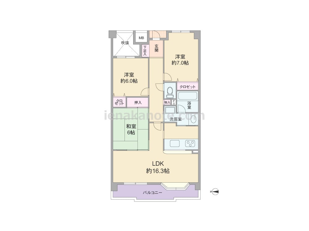 専有面積77.72平米の3LDK。共用廊下との間に吹き抜けがあるプライバシーに配慮されたプラン。全部屋6帖以上の広さがあります。LDK約16.3帖には和室が隣接しており、和室は室内廊下からも出入りが可能。キッチンは洗面室へアクセス可能な対面カウンタータイプです。各居室と室内廊下に収納が設けられています。