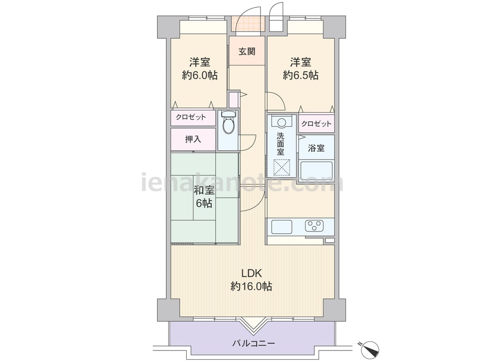 専有面積69.28平米の3LDK。リビングは横長で、全体がバルコニーに面しているため開放的。また窓が大きく、より採光が取れるようになっています。キッチンはカウンタータイプ。リビングに6帖の和室が隣接しており、襖を開けてリビングの一部として利用することも出来ます。廊下からも出入りできるので、独立した部屋としても使えるのがポイント。各居室に収納があり、廊下にも物入付きです。