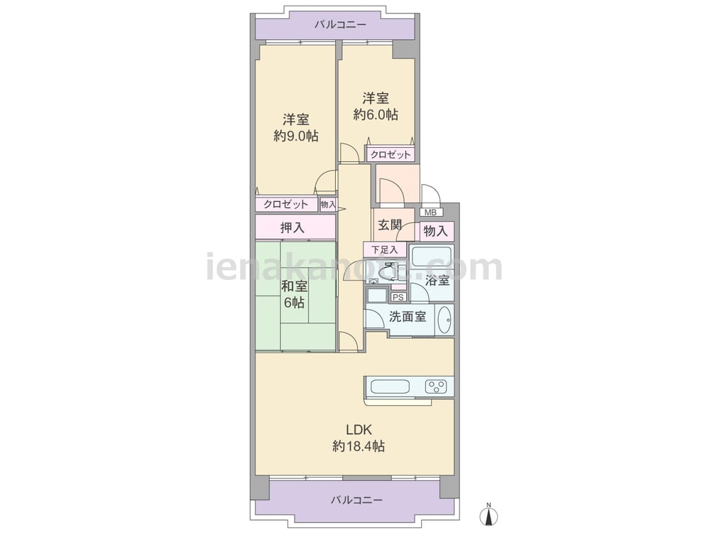 専有面積89.08平米の3LDK。センターインのプランで、南北両面にバルコニー付き。キッチンはカウンタータイプ。家事をしながら家族の様子を伺えます。LDKには和室6帖が隣接しており、襖を開放すれば、約24.4帖の空間としても利用可能。全室6帖以上で、主寝室は約9.0帖とゆったりしています。