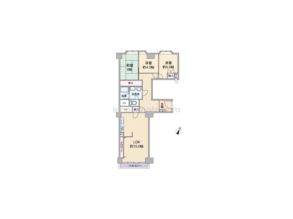 専有面積79.16平米の3LDK。居室の窓が共用廊下に直接面していない、センターインのプラン。LDKは約15.0帖大とゆとりがあり、日用品などを収納するのに便利なクロゼットもあります。洋室約4.0帖には収納スペースが無いため、場合によっては家具の設置が必要です。トイレは洗面室を通って出入りする造りのため、トイレ・洗面室使用時の動線が重なっています。