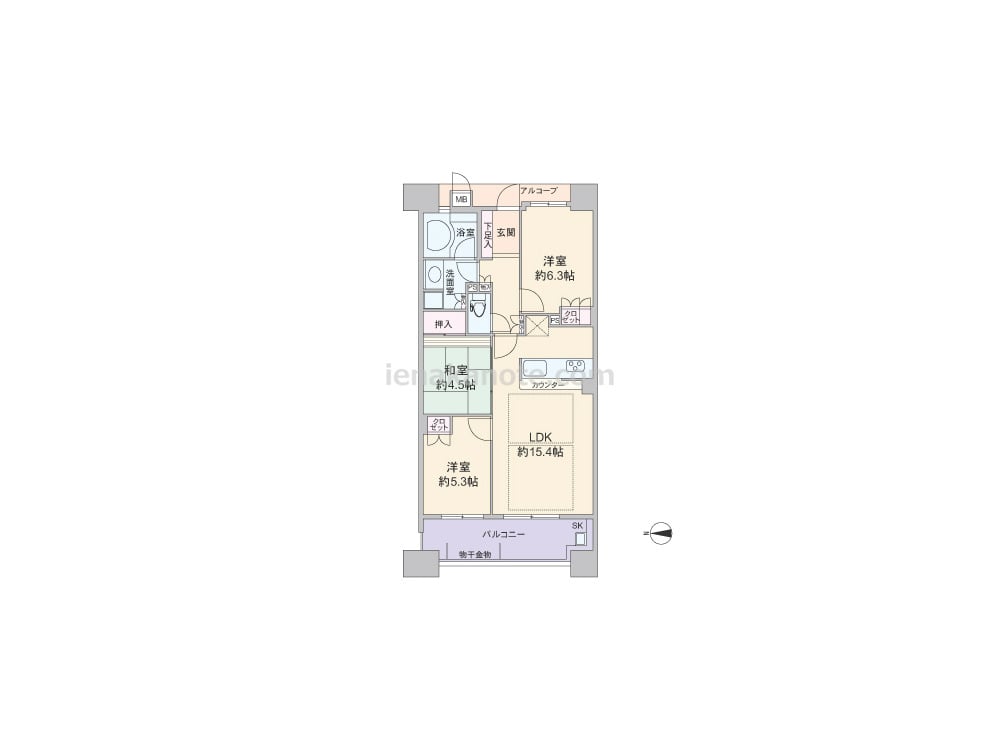 専有面積68.56平米の3LDK。共用廊下との間にアルコーブがある、プライバシーに配慮されたプラン。LDKは約15.4帖、キッチンは料理をしながら家族と会話を楽しめる対面カウンタータイプ。和室4.5帖と洋室約5.3帖はLDKを通って出入りします。収納スペースが各所にあり、浴室の窓は湿気がこもりにくく快適。バルコニー約12.6平米にはスロップシンクがあり、汚れ物を洗ったり、ガーデニングでの利用に便利です。