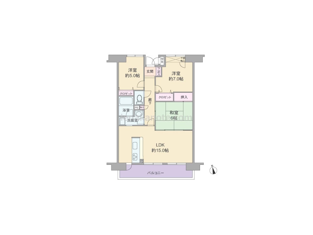 専有面積70.56平米の3LDK。LDKは約15.0帖、キッチンはリビング・ダイニングを見渡せる対面カウンタータイプ。キッチンは洗面室・バルコニーへ行き来でき、家事動線の良い造りです。和室6帖は室内廊下とLDKの2カ所から出入りでき、LDK側の襖を開放すれば約21.0帖大の空間に。各居室と室内廊下に収納が設けられています。