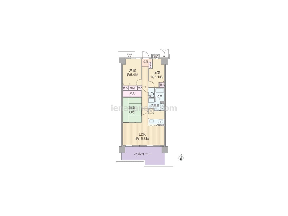 専有面積72.57平米の3LDK。LDKは約15.8帖、隣接する和室の襖を開放すれば約21.8帖大の空間に。和室は室内廊下からも出入りできます。対面カウンタータイプのキッチンは洗面室にも行き来が可能な家事効率の良い造り。各居室と室内廊下に収納スペース付き。バルコニー約12.42平米は一部出幅があり、ガーデニングを楽しんだり、洗濯物を干す際にもゆとりがあります。