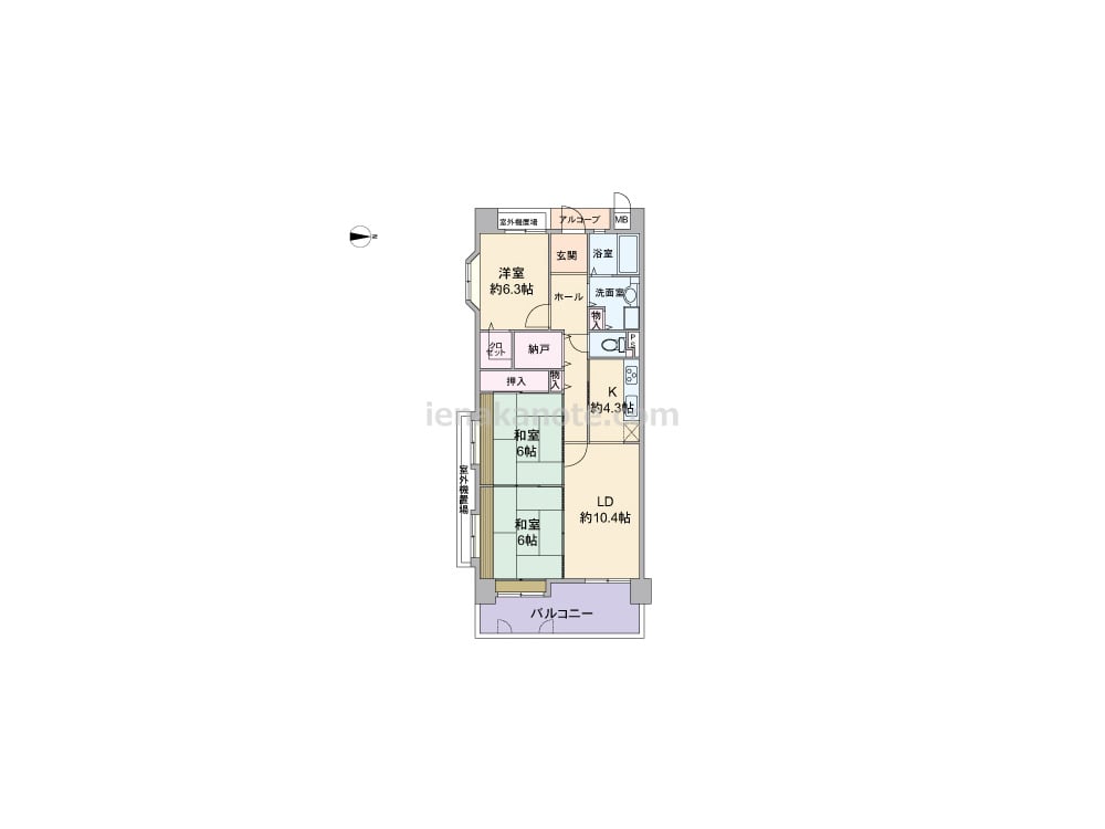 専有面積84.93平米の3LDK。LDKと和室二部屋が続き間になったプラン。キッチンは独立した配置のため、リビング・ダイニングに料理のにおいや生活感が伝わりにくいのが特徴です。和室の襖を開放すれば、空間を広々と使う事ができ、家具を置くのに便利な板間もあります。バルコニーに面する和室には押入がありませんが、室内廊下に物入れや収納力のある納戸付き。浴室はアルコーブに面して窓があり、換気がしやすく快適です。バルコニーは約11.34平米の広さがあります。