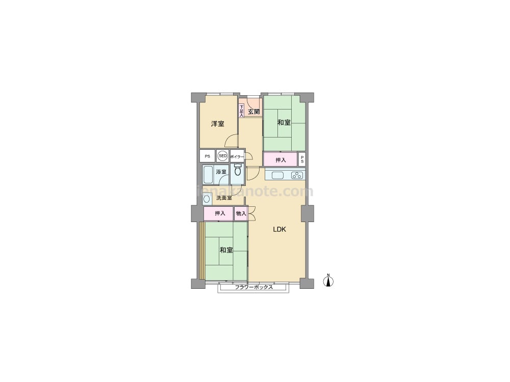 専有面積70.62平米(登記面積)の3LDK。玄関扉は内開きのため玄関スペースは限られますが、防犯性では安心の造りです。LDKと続き間の和室には、家具を置くのに便利な板間が付いています。キッチンはI型のウォールタイプ。玄関横の洋室にクロゼットがありませんが、その他の居室とLDKに収納スペース付き。ガーデニングを楽しむのにぴったりなフラワーボックスも付いています。
