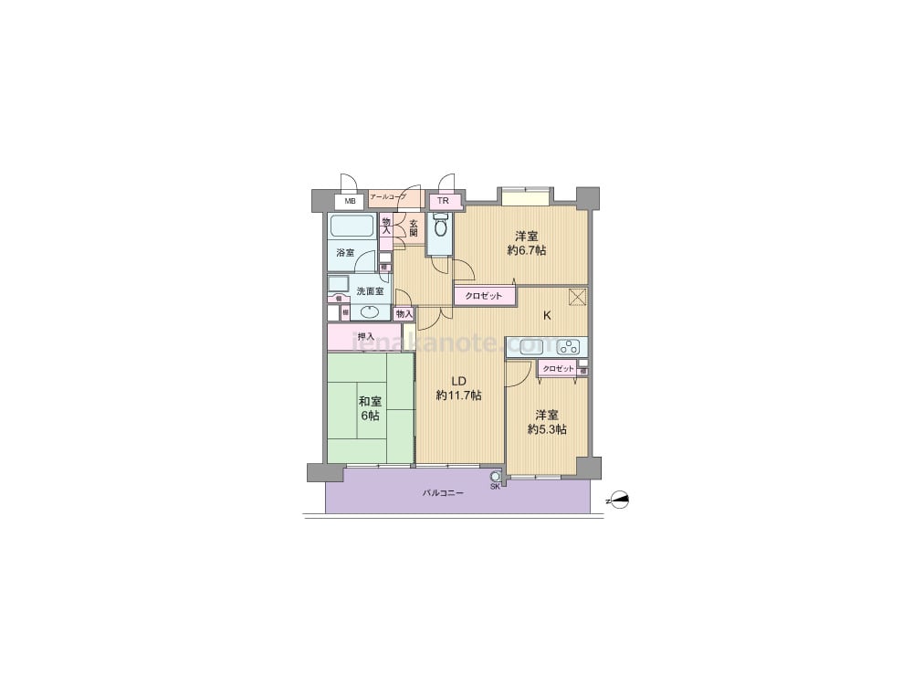 専有面積66.61平米の3LDK。西向き・ワイドスパンのプラン。生活感の出やすいキッチンは奥まって配置されているため、リビング・ダイニングはくつろぎの空間を保つ事が出来ます。和室の襖を開放すれば空間を広々と使う事が可能。収納スペースが各所にあり、共用廊下に面してトランクルームも付いています。バルコニー約13.07平米にはスロップシンクがあり、洗い物やガーデニングなどの利用に便利です。