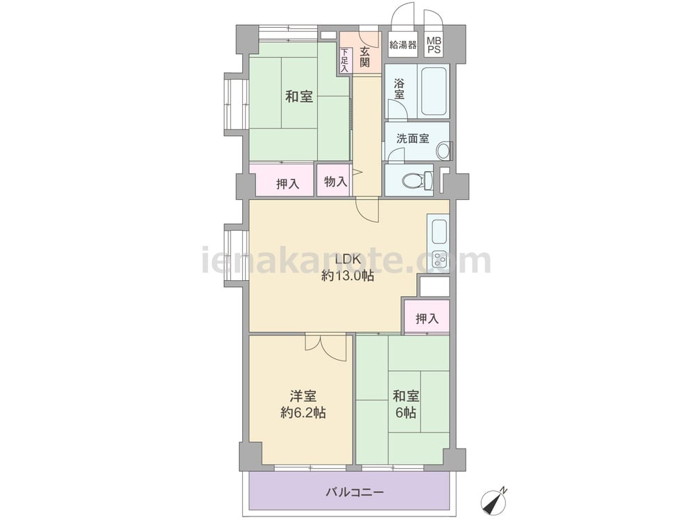 専有面積68.75平米の3LDK。内開きの玄関扉は玄関スペースが限られますが防犯面では安心です。LDKが部屋の中央にあるセンターリビングのプランで、キッチンはI型・ウォールタイプ。全部屋に窓があり、通風・採光の良い造り。洋室約6.2帖には収納スペースが無いため、家具を置くなど少し工夫が必要です。トイレは洗面室を通って出入りするため、トイレ・洗面室使用時の動線が重なっています。
