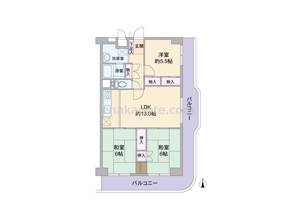 専有面積71.5平米の3LDK。全室バルコニーに面するプラン。居室の窓が共用廊下に面していないため、プライバシーを保ちやすいのもポイントです。LDKが部屋の中央にあり、LDKは約13.0帖、キッチンはI型の壁付け・オープンタイプ。洋室約5.5帖はLDKとの間を壁+物入で遮られているため、書斎や受験生の勉強部屋などの利用によさそうです。バルコニーは約22.64平米大と広く、ガーデニングをたっぷり楽しめます。