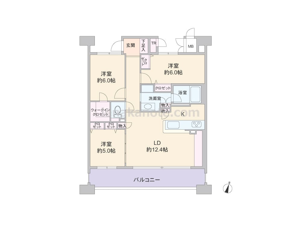 専有面積76.43平米の3LDK。ワイドスパンのプラン。リビング・ダイニングの窓は大きく、開放感があります。共用廊下に面して便利なトランクルーム付き。キッチンは対面式で、物入れ付き。LDKと洋室をつなげて、一つの空間としても使用可能。西側洋室6帖にウォークインクロゼット付き。バルコニーはゆとりがあり、ガーデニングもたっぷり楽しめます。
