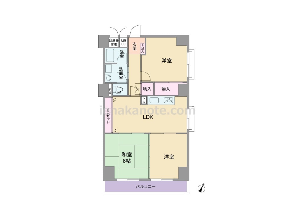 専有面積70.40平米の3LDK。居室の窓が共用廊下に面していない、プライバシーを保ちやすいプラン。LDKと洋室、和室6帖の3部屋が続き間になっており、引き戸を開放すれば空間を広々と使う事が出来ます。和室と隣の洋室には収納が無いため、場合により家具の設置が必要です。玄関横の洋室はLDKとの間を壁+物入で遮られているため、書斎や受験生の勉強部屋によさそう。トイレは洗面室を通って行き来します。