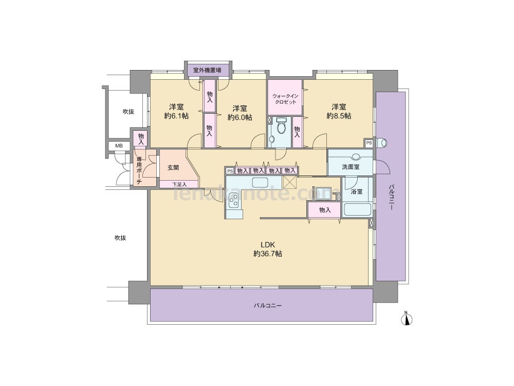 専有面積132.2平米の3LDK。玄関前に専用ポーチがあり、専用ポーチ内に物入付き。全室6帖以上、LDKは約36.7帖大の開放的なプラン。生活感の出やすいキッチンはリビング・ダイニングから奥まって配置され、キッチン横に洗濯機置場があります。トイレ内に手洗いカウンターがあり、浴室の窓は湿気がこもりにくく快適。洗面室にはバルコニーへの勝手口があります。収納スペースが各所に設けられ、主寝室約8.5帖は収納力のあるウォークインクロゼットが。バルコニーも約37.55平米と広く、スロップシンクも付いています。
