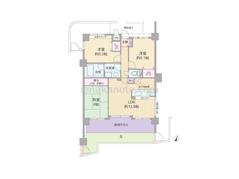 専有面積70.41平米の3LDK。全室6帖以上の広さがあるワイドスパンのプラン。LDK約13.8帖には和室6帖が隣接しており、引き戸を開放すれば約19.8帖大の空間としても使う事が出来ます。対面キッチンは料理中も家族と会話を楽しめ、床下収納庫があるのもポイント。テラスは約22.22平米と広く、一部芝もあり、テーブルセットを置いてくつろぎのひと時をすごしたり、ガーデニングや子供の遊び場にもぴったりです。