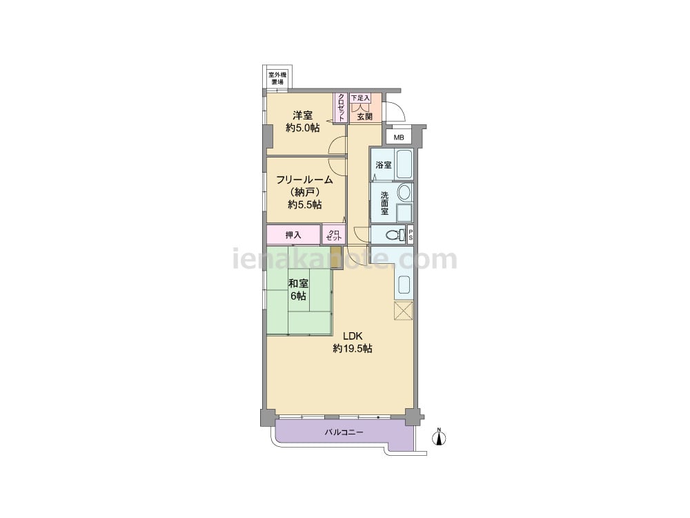 専有面積74.71平米の3LDK。共用廊下に面する居室の窓が無い、プライバシーを保ちやすいプラン。LDKは約19.5帖と広く、和室の引き戸を開放すれば約25.5帖大の空間にする事も出来ます。キッチンはL字型の壁付け・オープンタイプ。フリールーム約5.5帖は洋室仕様+収納スペース付きのため、居室としても十分に使える一室です。
