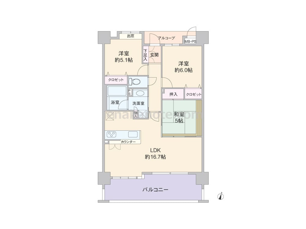 専有面積70.07平米の3LDK。LDK約16.7帖にはコーナーサッシが用いられ、キッチンはリビング・ダイニングを見渡せる対面式。和室5帖の引き戸を開放すればLDKを広々と使う事が出来ます。和室の板間は家具を置くのに便利。各居室と洗面室に収納が設けられています。バルコニーは約12.88平米あり、ガーデニングを楽しむのにもぴったりです。