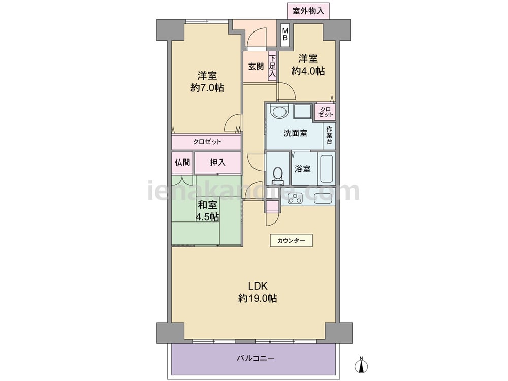 専有面積77.59平米の3LDK。LDKは約19.0帖のゆとりがあり、和室の引き戸を開放すれば約23.5帖大の空間に。和室は室内廊下からも出入りできます。キッチン背面のカウンターは調理台や配膳などに便利。収納スペースも各所に設けられています。