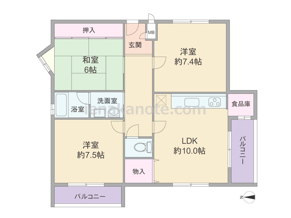 専有面積72平米の3LDK。どの部屋も6帖以上のゆとりが確保されています。玄関扉は防犯性に配慮された内開き型。LDKは約10.0帖、キッチンはI型の壁付け・オープンタイプ。洋室二部屋には収納が無いため、家具を置くなど少し工夫が必要です。浴室の窓は湿気がこもりにくく快適。和室6帖には出窓が付いています。