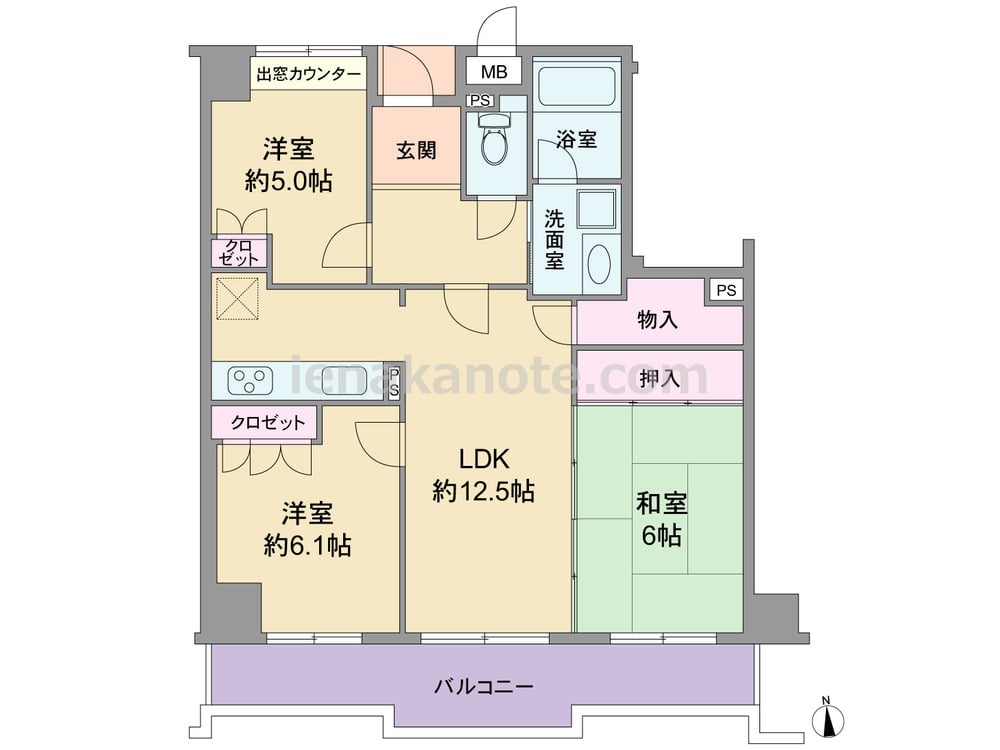 専有面積68.88平米の3LDK。南向き・ワイドスパンのプラン。LDKは約12.5帖、独立型のキッチンはリビング・ダイニングへ生活感が出にくい造り。LDKに隣接する和室の引き戸を開放すれば、約18.5帖大の空間に利用出来ます。全室に収納スペース付き。バルコニー約10.98平米は一部出幅があります。