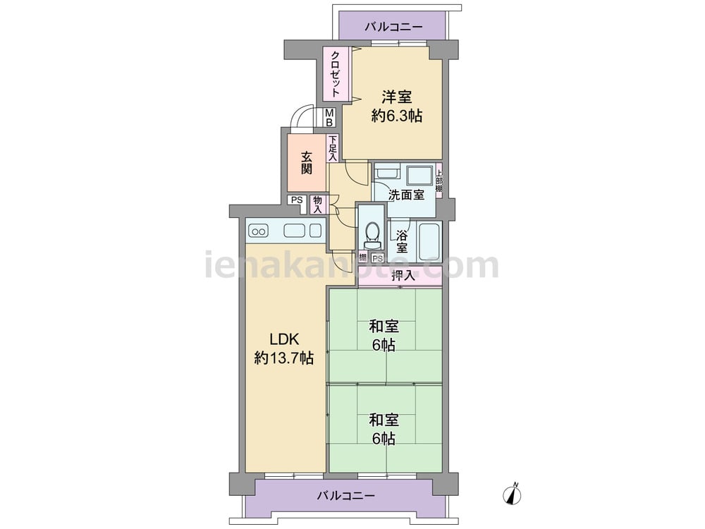 専有面積74.25平米の3LDK。どの部屋も6帖以上の広さがある、センターインのプラン。南北両面にバルコニーがあるのもポイントです。LDK約13.7帖と和室二部屋が続き間になっており、引き戸を開放すれば空間を広々と使う事が出来ます。キッチンはI型の壁付け・オープンタイプ。バルコニーに面する和室には押入がありませんが、その他の居室と室内廊下、洗面室に収納が確保されています。