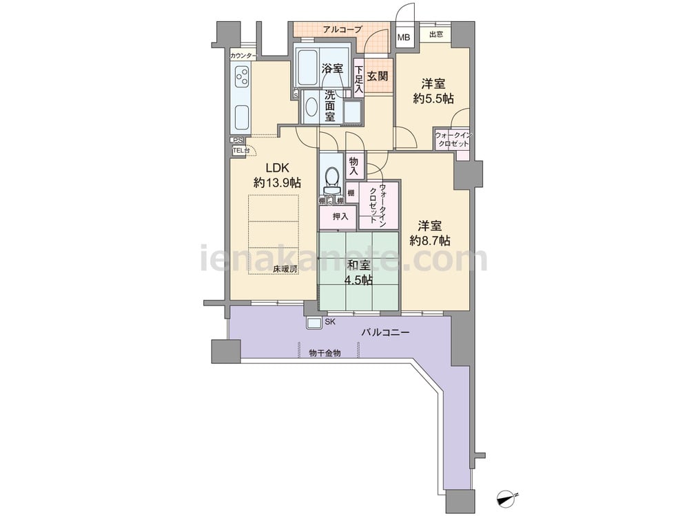 専有面積73.99平米の3LDK。ワイドスパンのプラン。LDK約13.9帖に隣接する和室の引き戸を開放すれば、約18.4帖大の空間に利用出来ます。生活感の出やすいキッチンは奥まって配置され、キッチン、浴室の窓は換気がしやすく快適。各居室と室内廊下、洗面室に収納が確保されています。バルコニー約19.80平米のスロップシンクは洗い物やガーデニングでの利用に便利です。