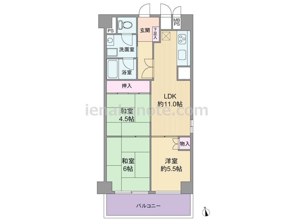 専有面積60.5平米の3LDK。共用廊下に直接面する窓が無く、玄関先から室内を見通せない、プライバシー性の高いプラン。どの部屋もLDK約11.0帖を通って行き来するため、家族のコミュニケーションの機会が増えます。また、引き戸を開放すれば空間を広々と使う事が出来ます。トイレは洗面室を通って出入りする造りのため、トイレ・洗面室使用時には注意が必要です。