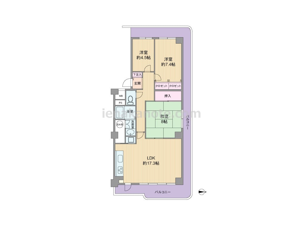 専有面積81.71平米の3LDK。全室バルコニーに面した明るく・開放的なプラン。LDKは約17.3帖あり、キッチン横に洗濯機置場とバルコニーへの勝手口が付いた家事動線のよい造り。和室8帖は室内廊下とLDKの2カ所から出入りでき、個室や客間、リビングスペースの延長など色々な用途に使えます。洋室約4.5帖にはクロゼットが無いため、家具の配置など工夫が必要かもしれません。バルコニーは約36.11平米の広さがあります。