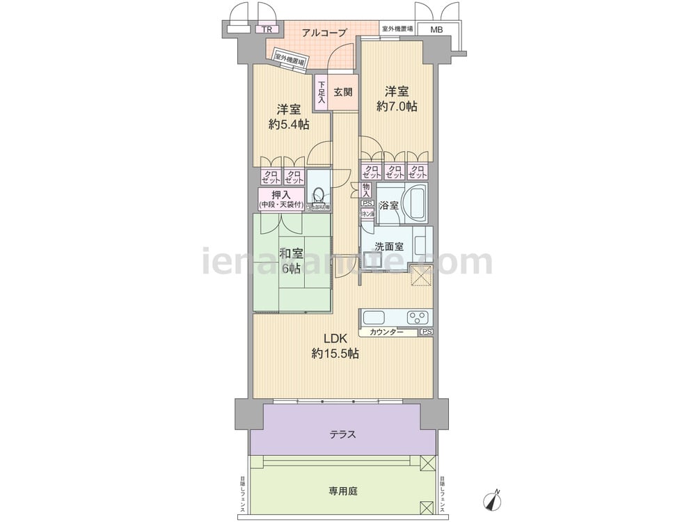 専有面積76.60平米の3LDK。専用庭付きプラン。玄関と共用廊下の間にはアルコーブがあり、共用廊下に面してトランクルームが付いています。LDKは約15.5帖、キッチンは対面カウンタータイプの仕様で、キッチン背面から洗面室へアクセス可能な2WAY動線。和室6帖もLDKと室内廊下の2カ所から出入りできます。収納が豊富にあるのもポイント。テラスは約12.16平米、専用庭は約14.08平米の広さがあります。