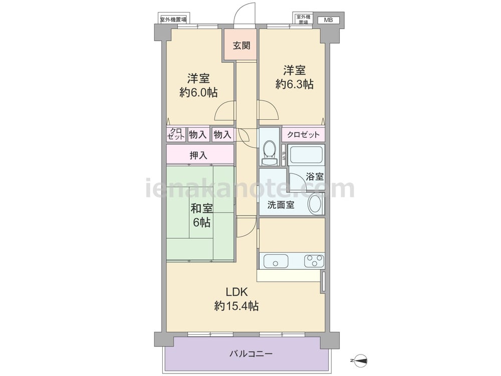 専有面積75.6平米の3LDK。どの部屋も6帖以上のゆとりが確保されたプラン。LDK約15.4帖には和室6帖が隣接しており、和室は玄関ホールからも出入りできます。対面式カウンターキッチンは料理をしながら家族と会話を楽しめます。各居室と玄関ホールに収納付きです。