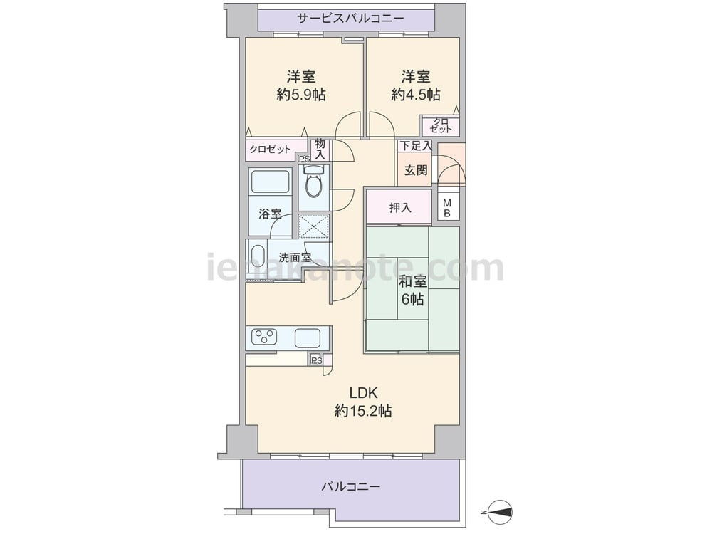 専有面積70.77平米の3LDK。東西両面にバルコニーがある、センターインのプラン。玄関先から室内を直接見通せないのもポイントです。LDK約15.2帖には和室6帖が隣接し、引き戸を開放すれば約21.2帖大の空間に利用出来ます。対面カウンタータイプのキッチンは洗面室へアクセス可能な2WAY仕様。各居室と室内廊下に収納が確保されています。