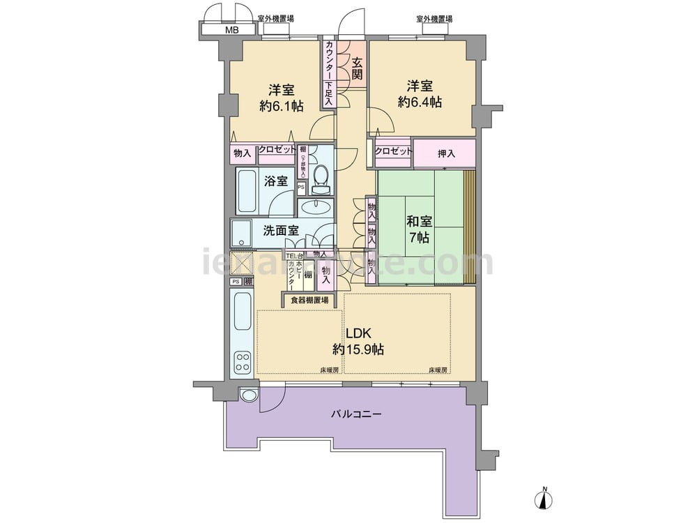 専有面積81.9平米の3LDK。どの部屋も6帖以上の広さが確保された、横長リビングのプラン。LDKは約15.9帖、キッチンは開放的なウォールタイプ。キッチンから洗面室・バルコニーへアクセス可能な家事効率の良い造りです。和室7帖はLDKと室内廊下の2カ所から出入りが可能。収納スペースが豊富にあり、キッチン付近にはカウンターもあります。スロップシンク付きのバルコニーは約16.96平米とスペースにゆとりがあり、ガーデニングを楽しむのによさそうです。