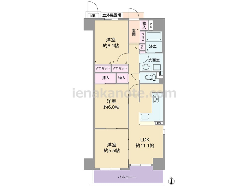 専有面積67.06平米の3LDK。LDKは約11.1帖、キッチンはL字型の対面タイプ。洋室約5.5帖はLDKと洋室約6.0帖と続き間になっており、個室にしたり、引き戸を開放して空間を広々と使うなど、フレキシブルにプラン変更出来ます。洋室約5.5帖には収納がありませんが、その他の居室と室内廊下、玄関ホールに収納スペース付きです。