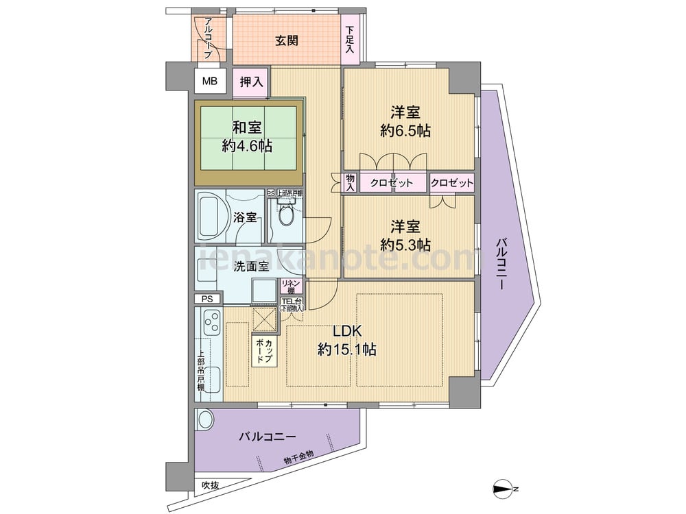 専有面積77.03平米の3LDK。エントランスの窓は光や風を取り込む事ができ、スペースにゆとりがあるのも特徴です。LDKは約15.1帖、キッチンはI型の壁付けタイプ。キッチン横から洗面室へアクセスでき、家事動線のよい造りです。和室4.6帖は個室や客間など色々な用途に使える一室。各居室と室内廊下、洗面室に収納が設けられています。バルコニーが2カ所あり、東側バルコニーはスロップシンク付きです。