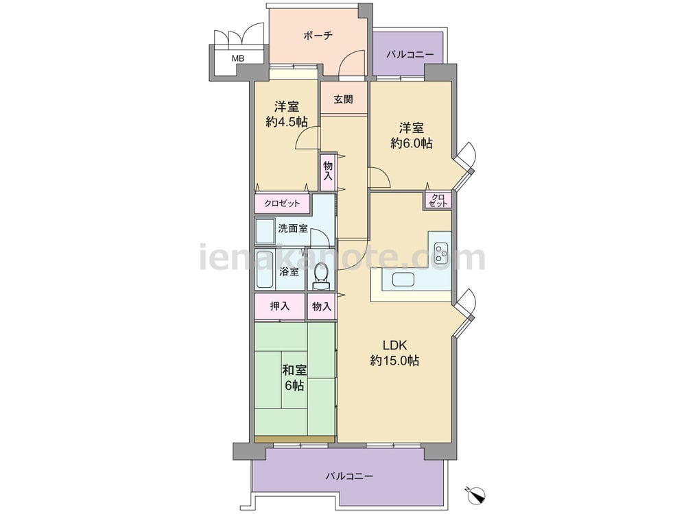 専有面積74平米の3LDK。LDKは約15.0帖、キッチンはL字型の対面・カウンター仕様。LDKには和室6帖が隣接しており、引き戸を開放して約21.0帖大の空間に利用してもよさそうです。各居室と玄関ホール、LDKに収納スペース付き。トイレは洗面室を通ってアクセスします。