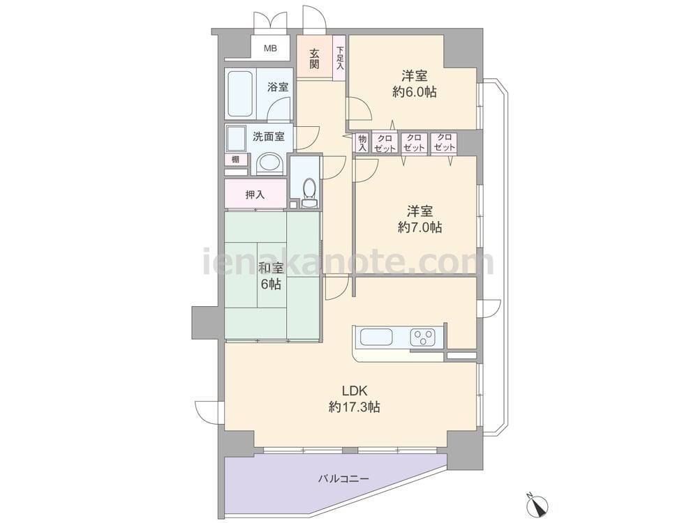 専有面積78.2平米の3LDK。廊下がクランク状になったプライバシーに配慮されたプラン。全部屋6帖以上、LDKは約17.3帖、主寝室は約7帖の広さがあります。また2カ所にバルコニーがあり、LDKは2面採光の為、明るく開放感のある空間。キッチンはカウンタータイプで換気窓付きです。