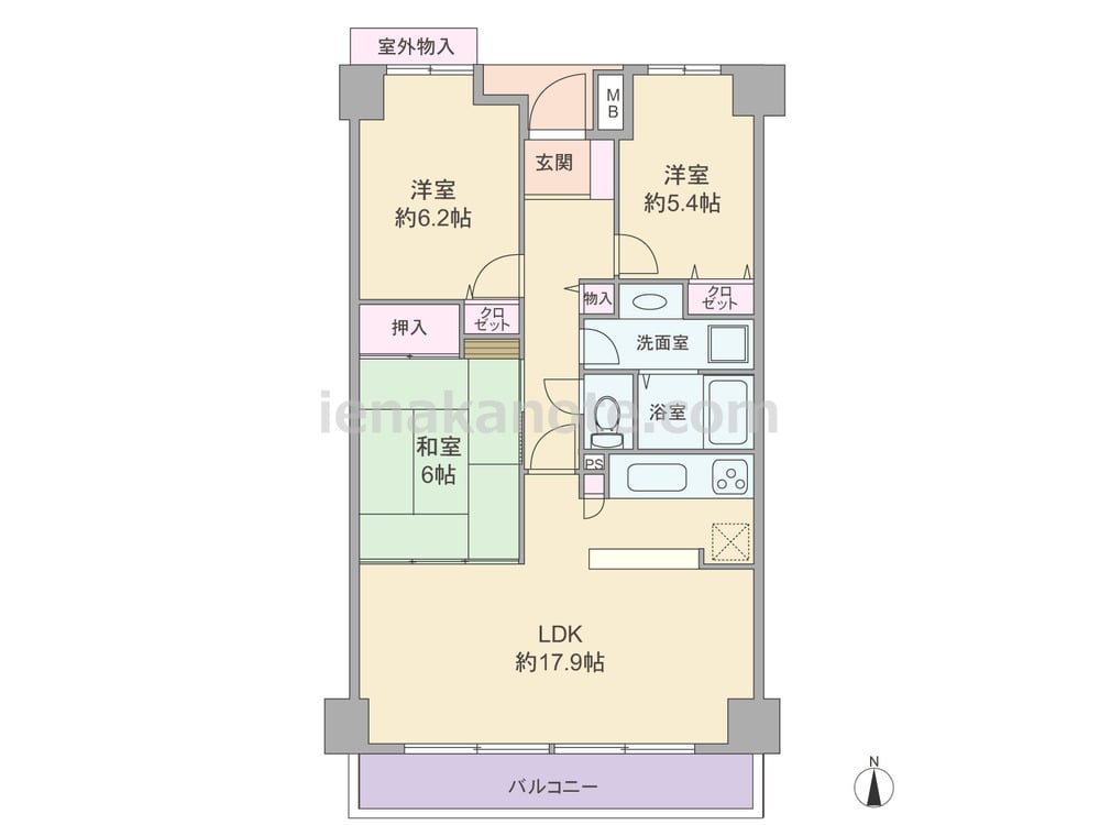 専有面積77.59平米の3LDK。横長リビングのプランで、LDKは明るく、開放感のある空間。また、和室と続き間になっており、約23.9帖の一つの空間としても使用出来ます。各部屋に収納スペース付き。キッチンはオープンタイプ、背面にハッチカウンターが付いて、便利です。