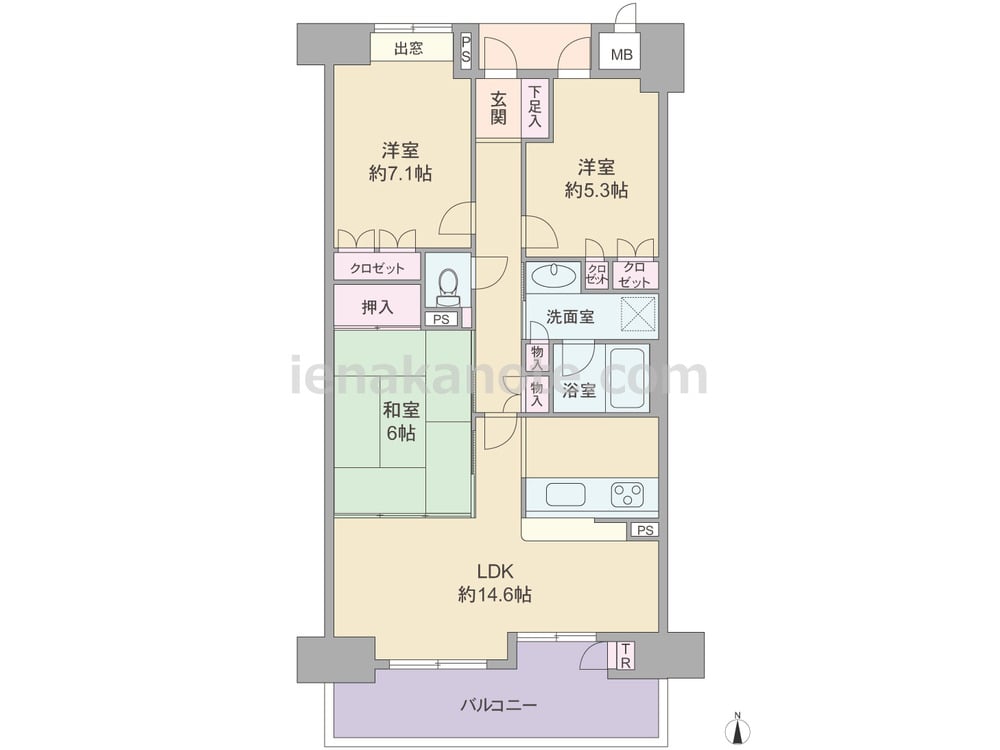 専有面積74.05平米の3LDK。玄関前にはアルコーブ付き。キッチンはカウンタータイプで、家事をしながら家族の様子を窺うことができます。和室6帖がリビング・ダイニングに隣接しており、室内廊下からも出入りが可能。各室に収納が確保され、室内廊下・バルコニーにも物入があります。