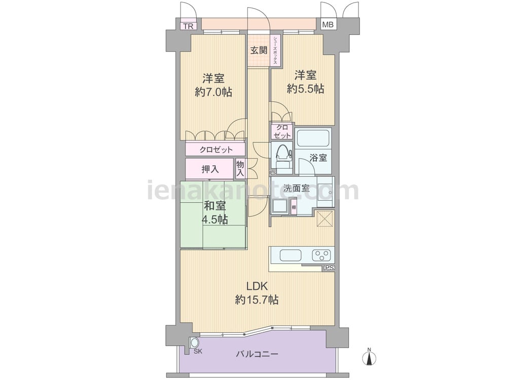 専有面積73.25平米の3LDK。LDKは15.7帖、キッチンはカウンタータイプ。家事効率の良い2WAY動線が魅力です。南面の開口部が広く、光を採り入れやすいプラン。トランクルームが付いています。